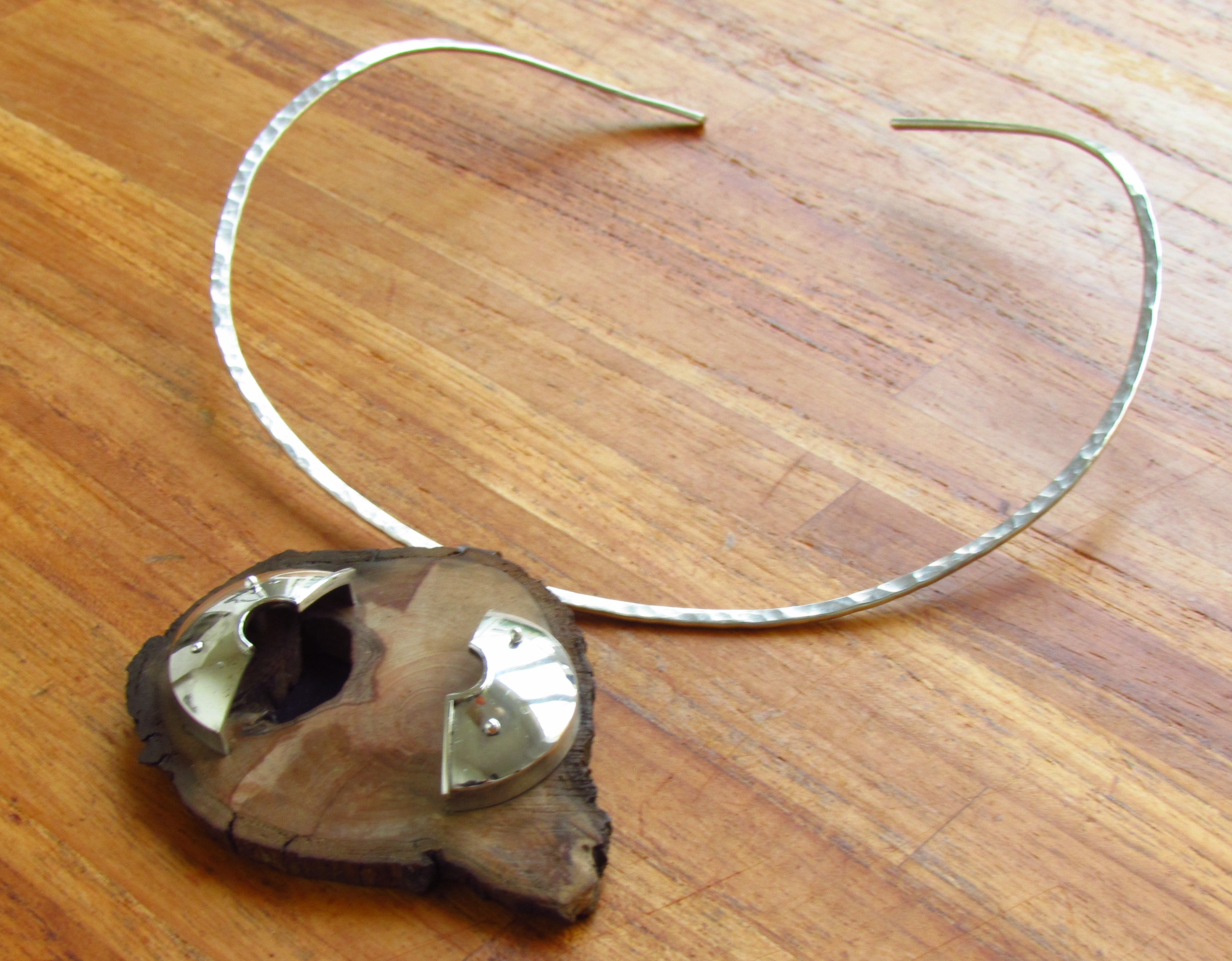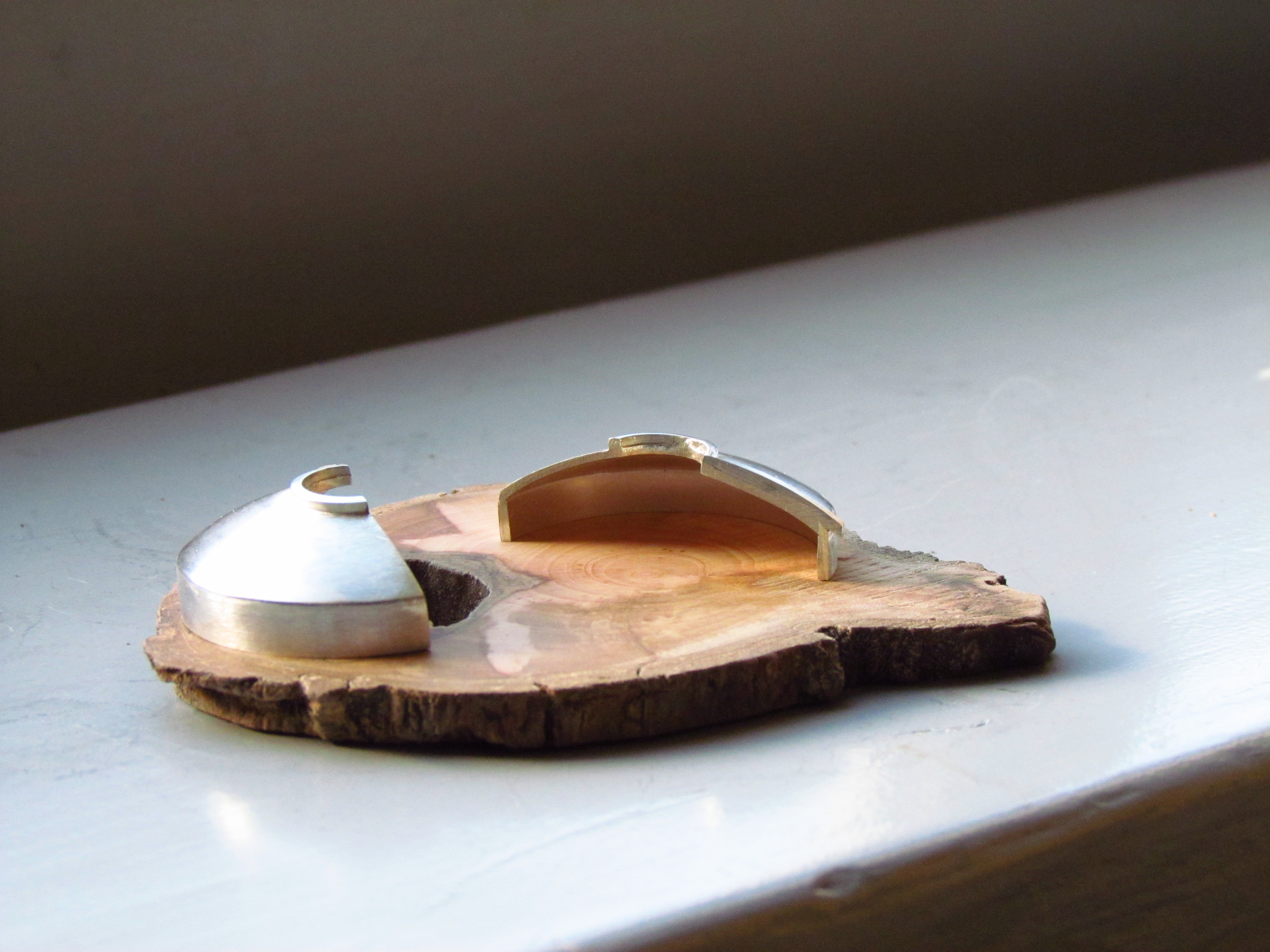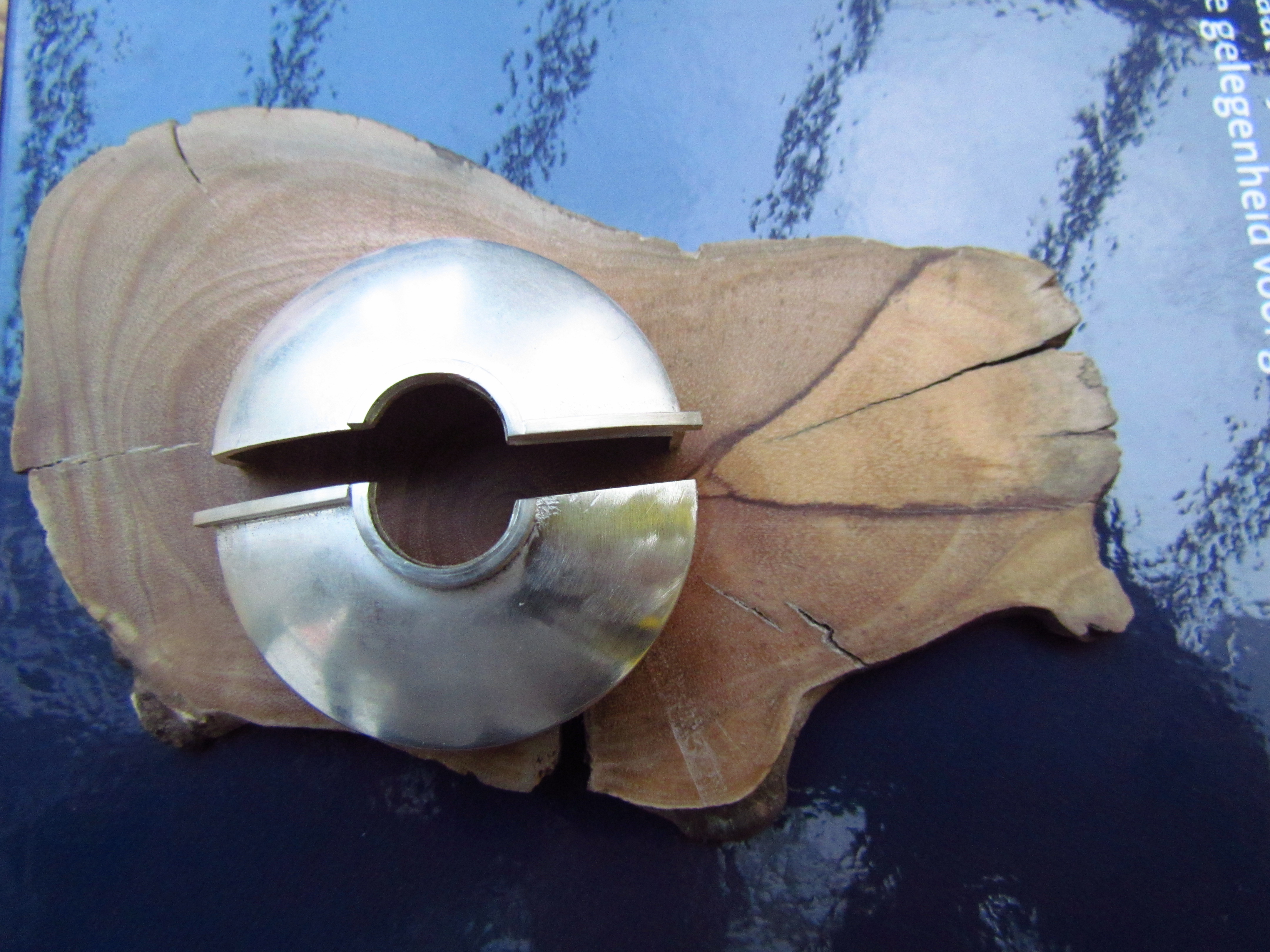 Deze hanger bestaat uit een zilveren bolle vorm, die doorgezaagd is. Het wordt net een maquette van een gebouwtje. Op een houten onderplaat (in proefopstelling eerst van olijfhout, de definitieve van perenhout) met een vijver van titanium wordt dat nog geaccentueerd. De ophanging is ook van titanium, waardoor het als een hanger aan een spang te dragen is.