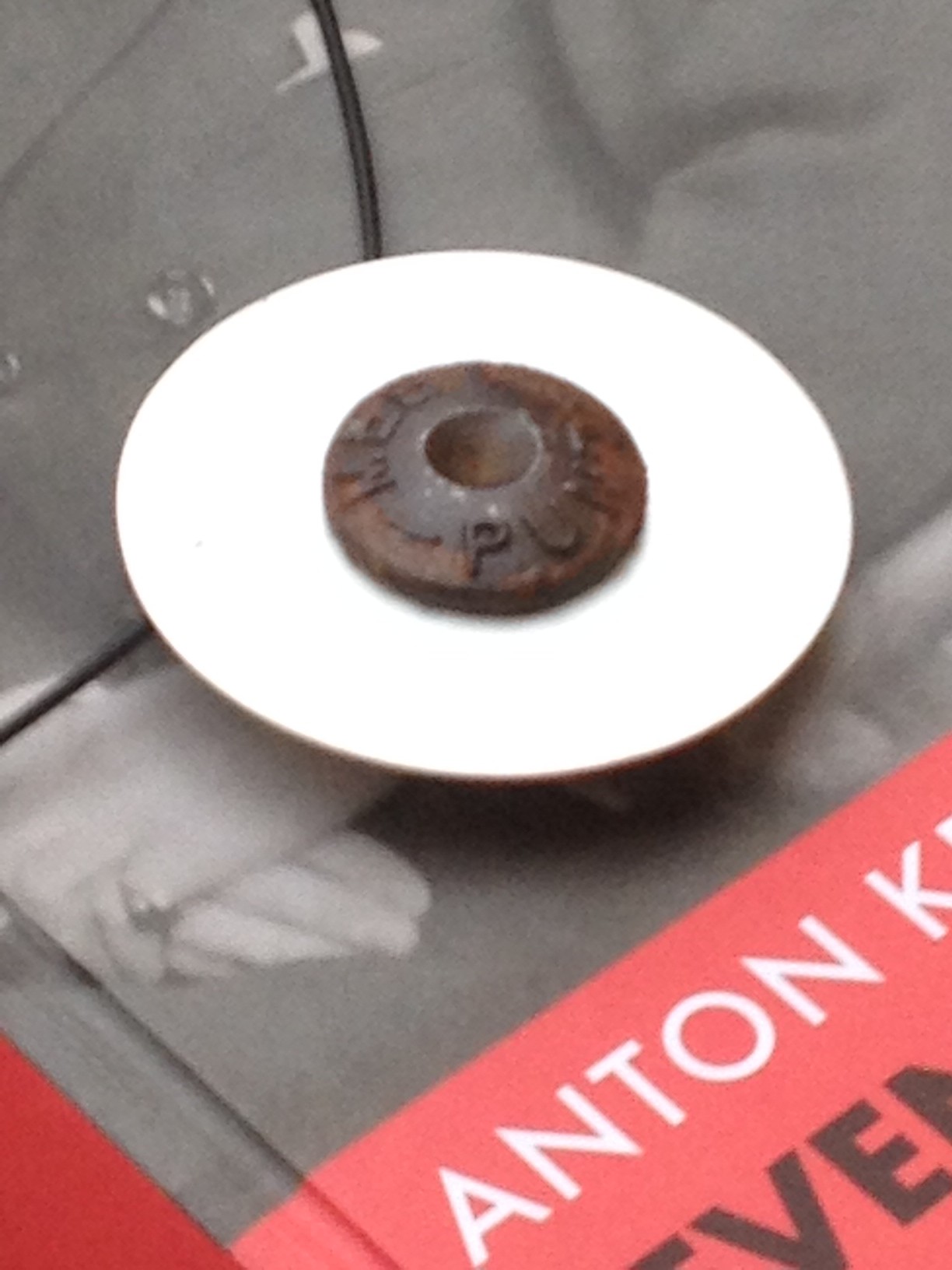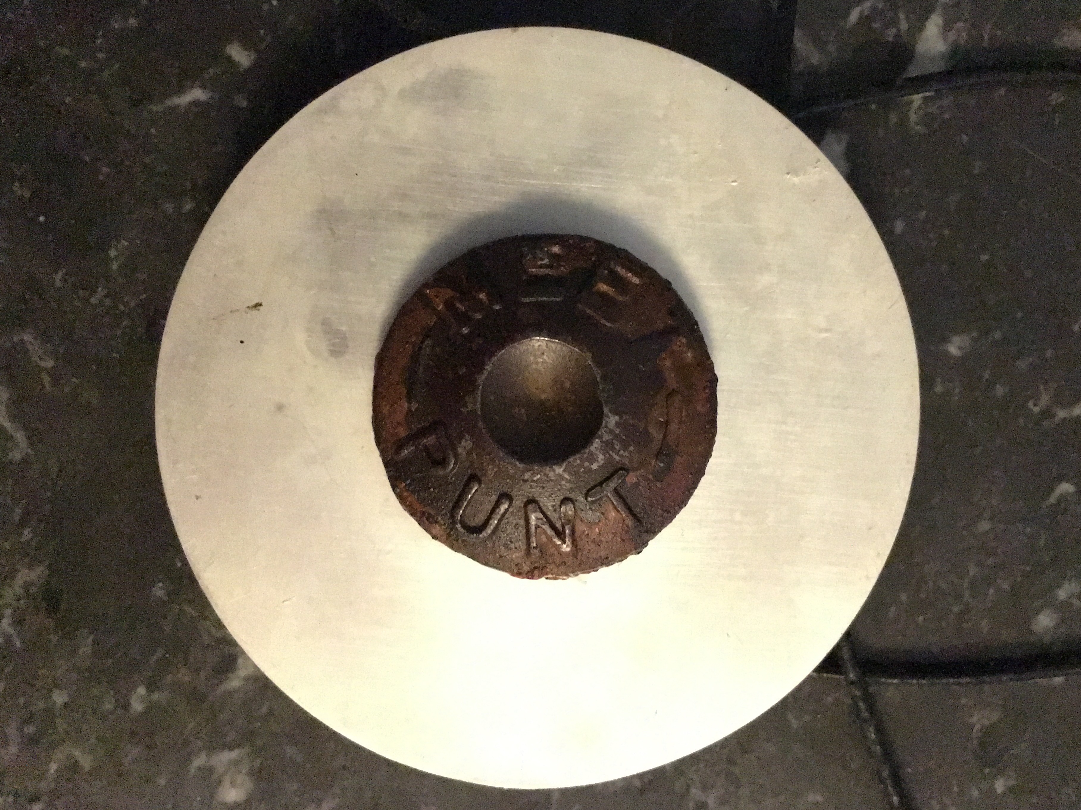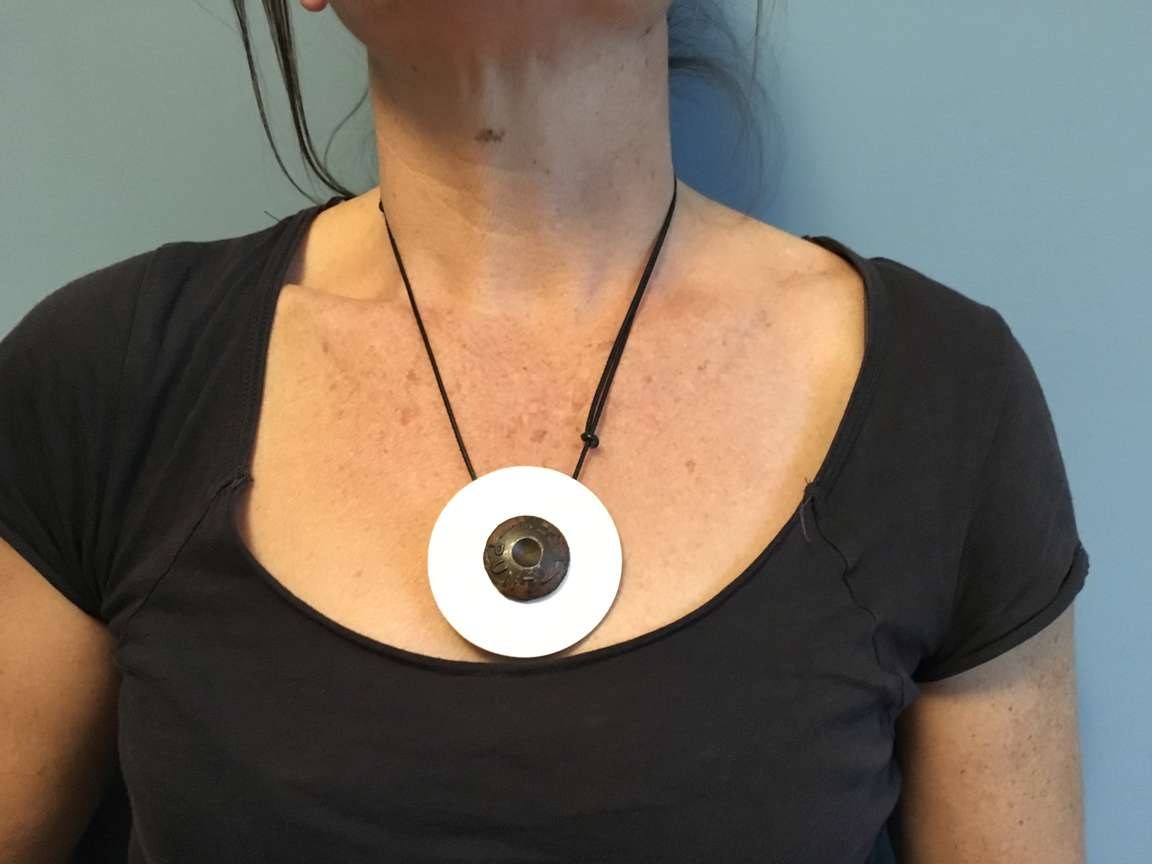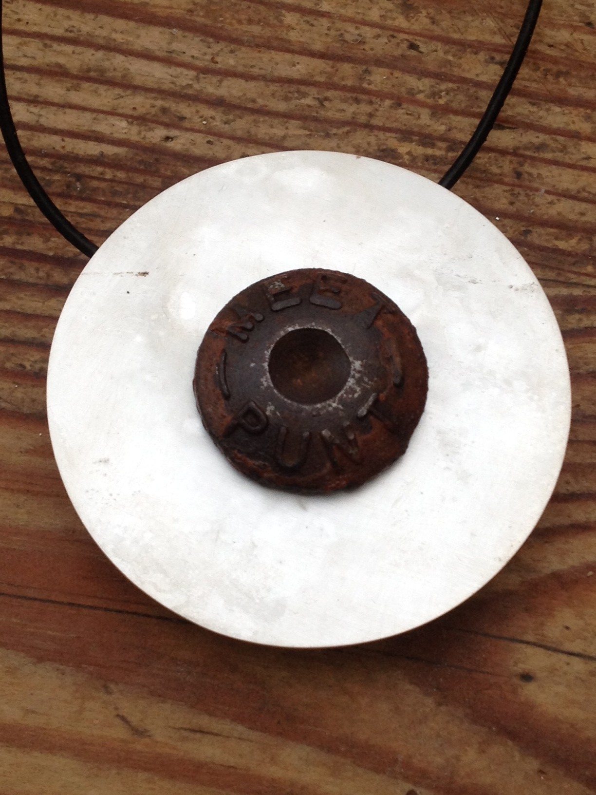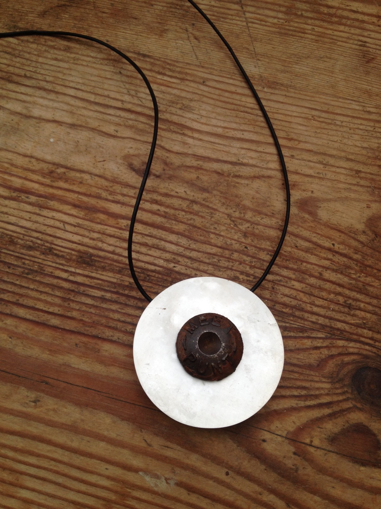 Een gevonden gietijzeren pin vormt de basis voor deze hanger. Er op staat MEET PUNT. de zilveren schijf eromheen is afgekookt en daardoor gewolkt wit. Het gietijzer is heel moeilijk te bewerken, de grote pin heb ik aan de achterzijde afgezaagd. Aan de zilveren schijf heb ik twee ogen gesoldeerd. Een leren koord met twee schuifknopen zorgt dat de ketting in lengte verstelbaar is.