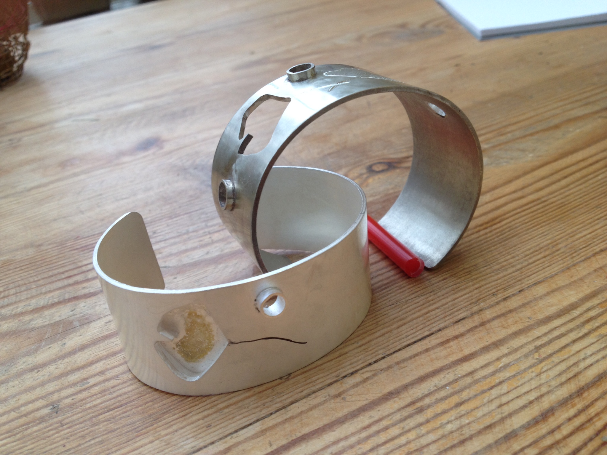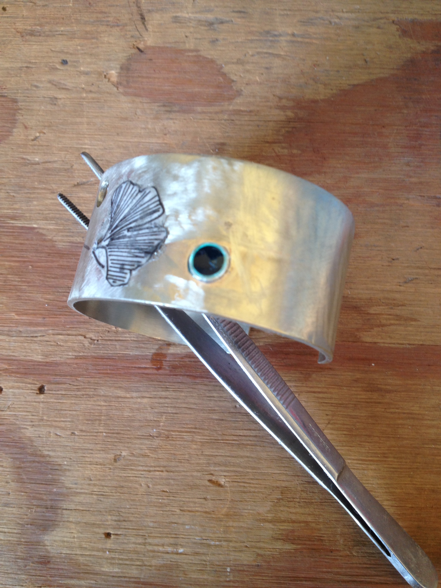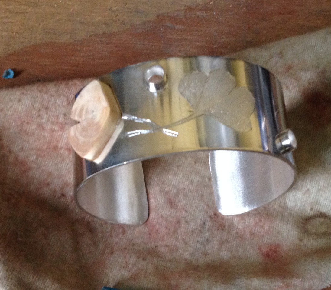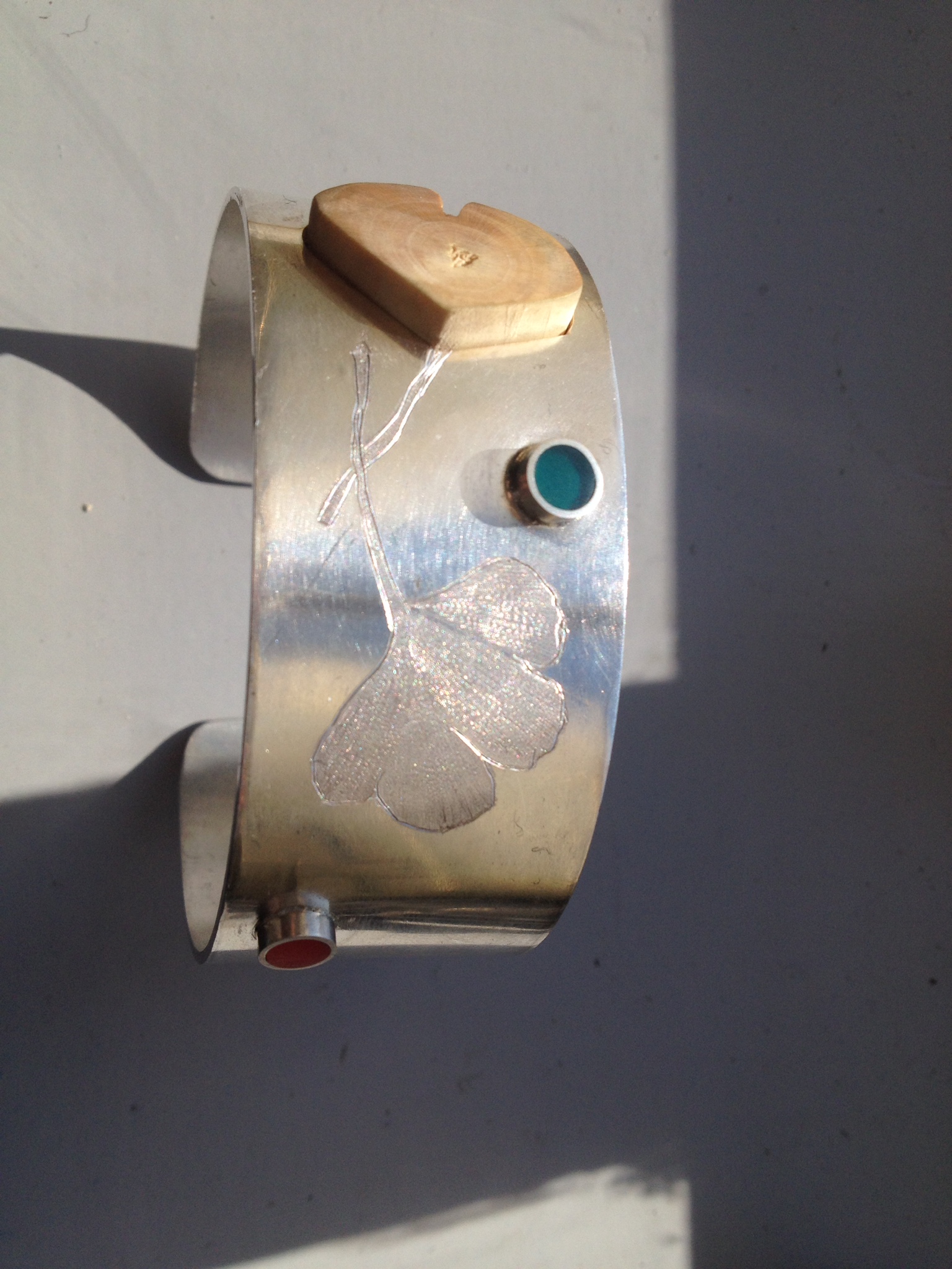 Deze zilveren armband heb ik in opdracht gemaakt. Eerst een proefmodel in alpaca met een uitgezaagd ginkgo blad. in de zilveren armband heb ik het houten ginkgo blad in een zetkastje gezet. Het is ook echt van ginkgo hout gemaakt.