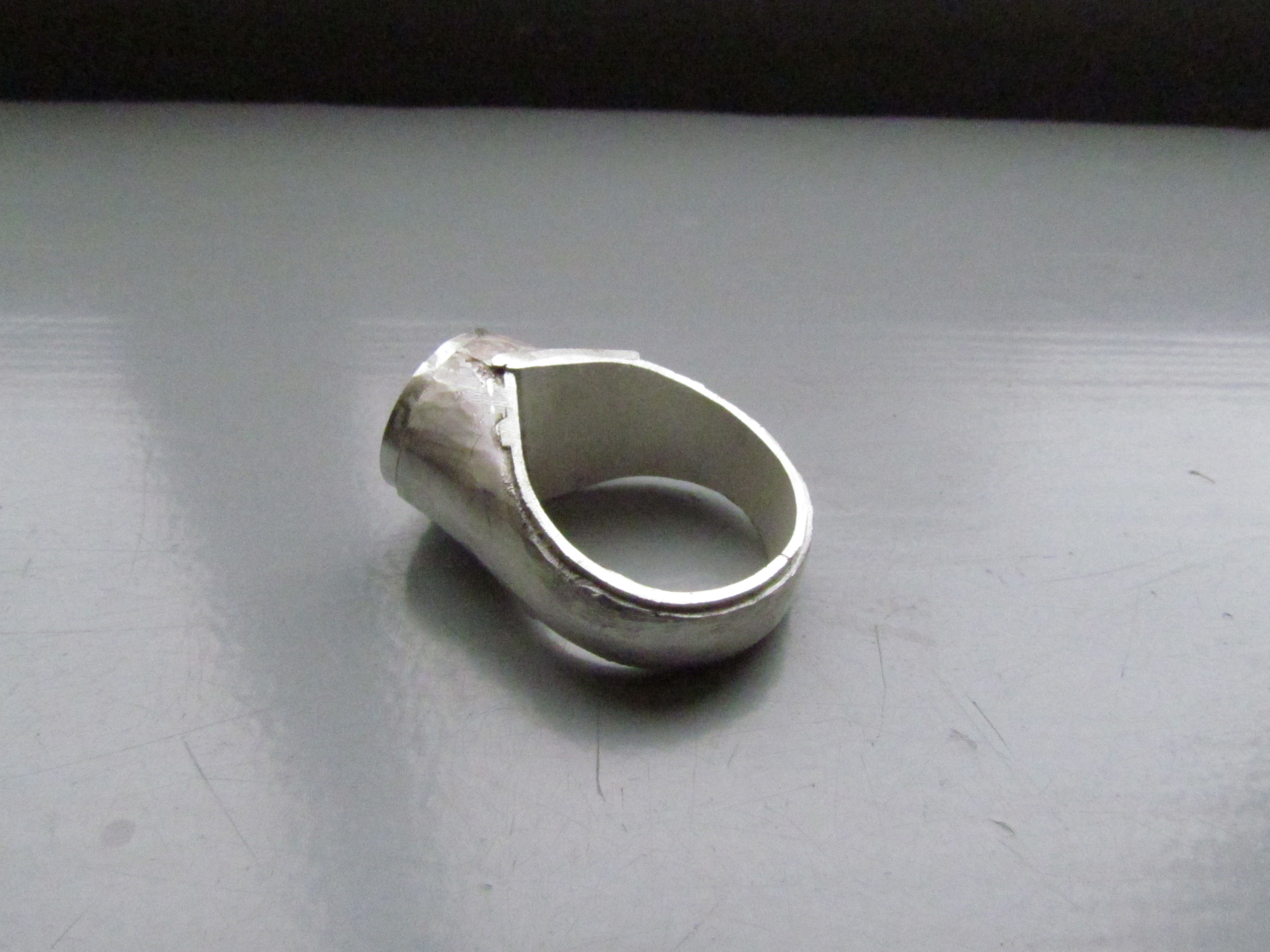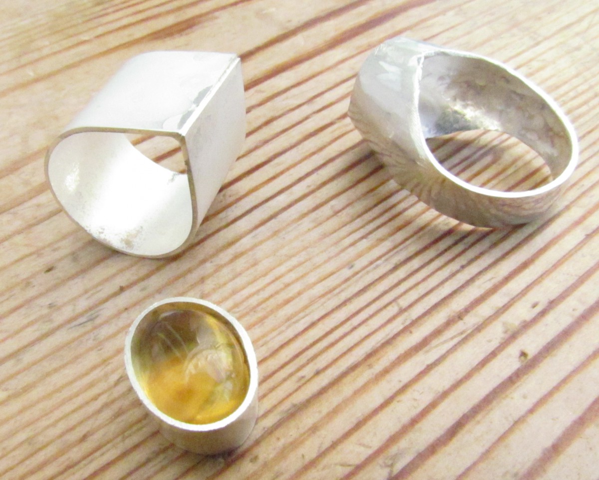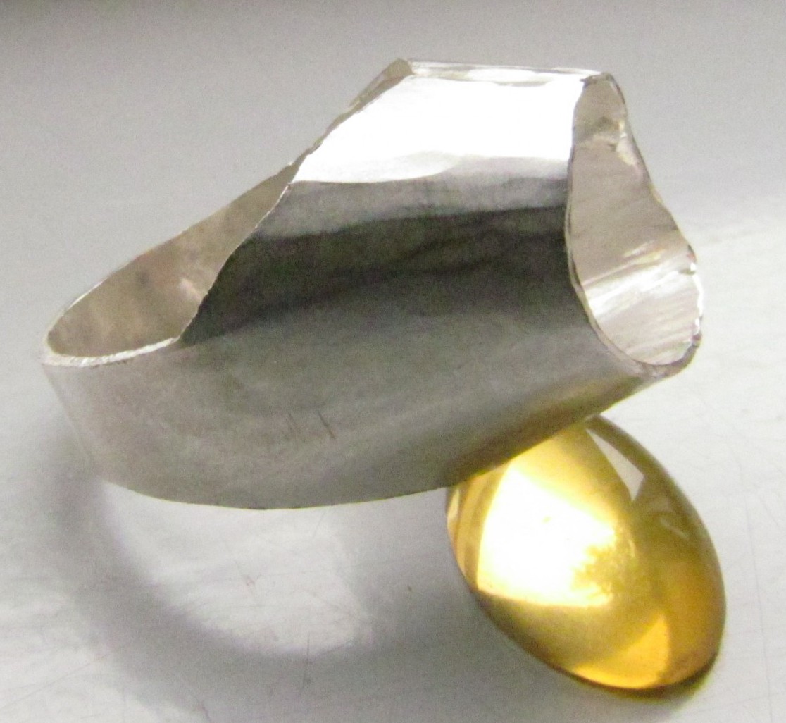 Deze mantelring bestaat uit een buitenring van zilver, in een speciale vorm gezaagd en bol geklopt. De binnenmantel, ook van zilver is apart gemaakt en later in de buitenring gesoldeerd. Voor de gele steen, citrien, is eerst een ovaal zetkastje gemaakt en in de ring gesoldeerd. Als laatste heb ik de steen gezet.