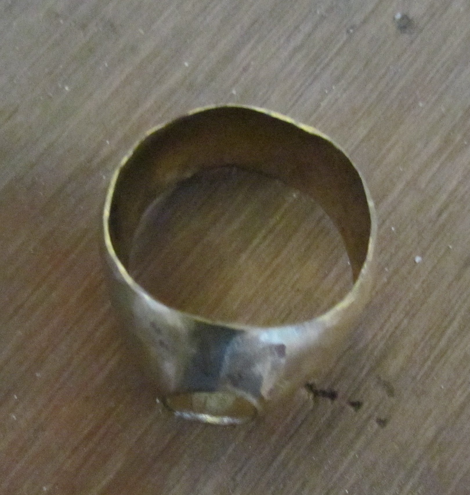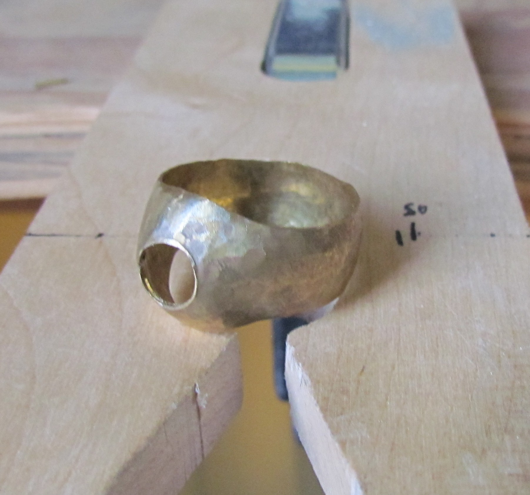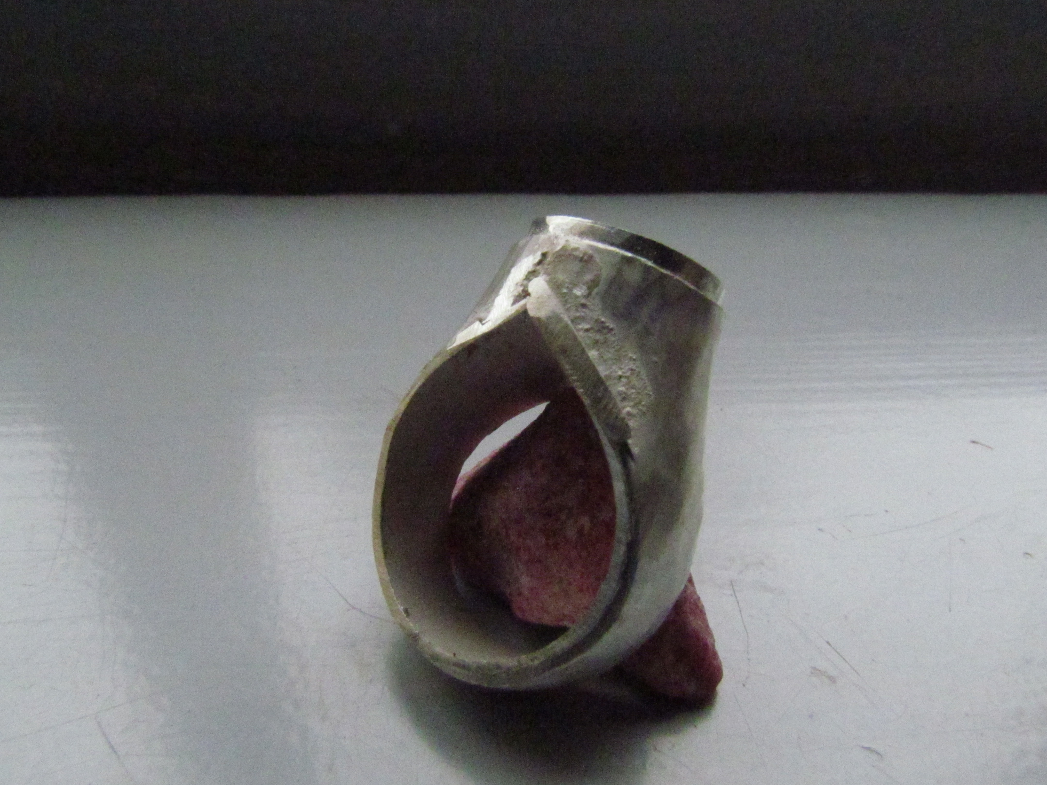 Deze mantelring bestaat uit een buitenring van zilver, in een speciale vorm gezaagd en bol geklopt. De binnenmantel, ook van zilver is apart gemaakt en later in de buitenring gesoldeerd. Voor de gele steen, citrien, is eerst een ovaal zetkastje gemaakt en in de ring gesoldeerd. Als laatste heb ik de steen gezet.