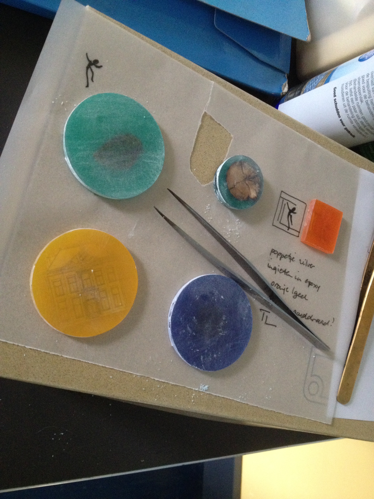 zetkastjes met tekst ingegoten met epoxy, samen vormen ze de zin: girl with blue eyes i love you