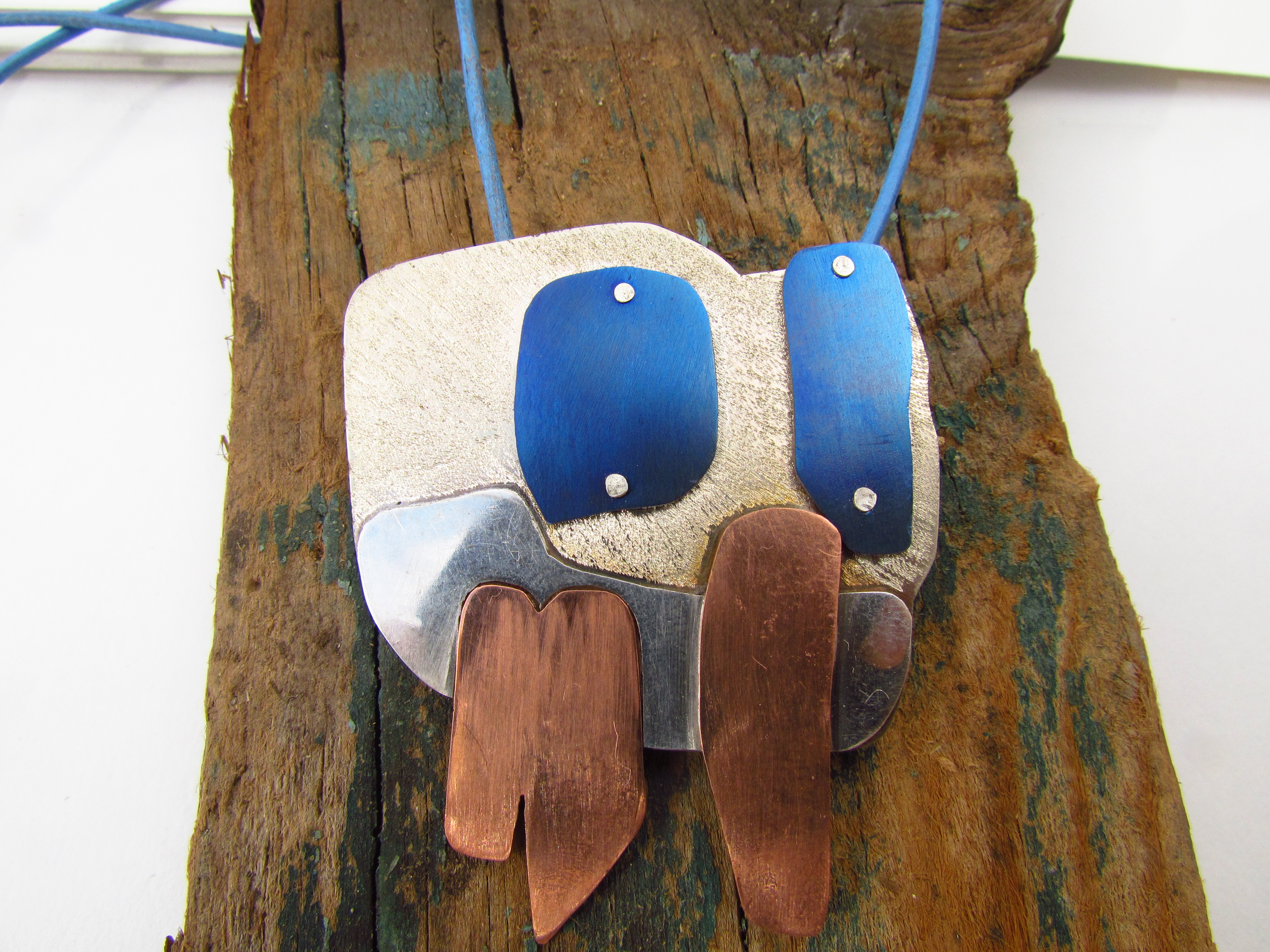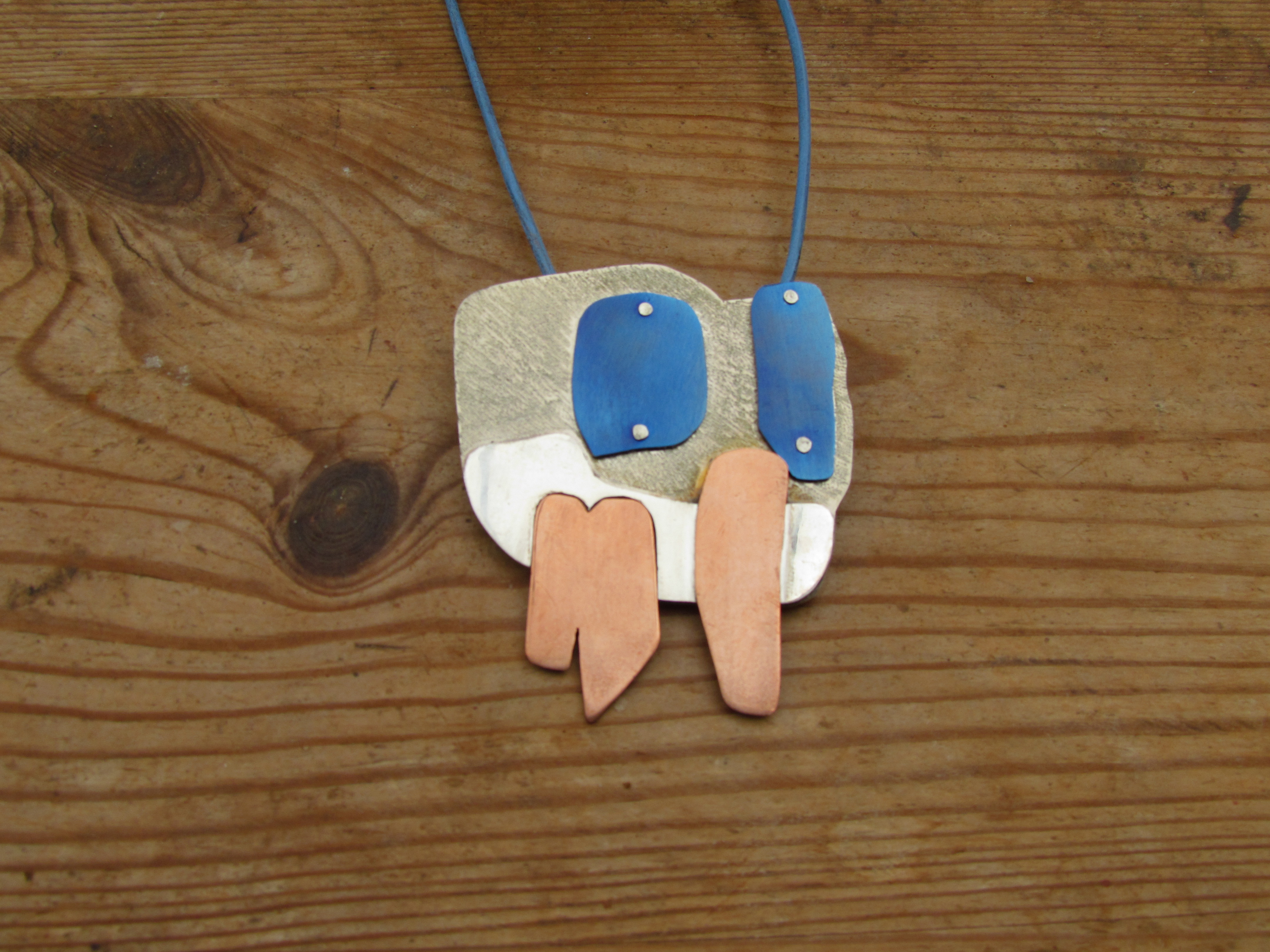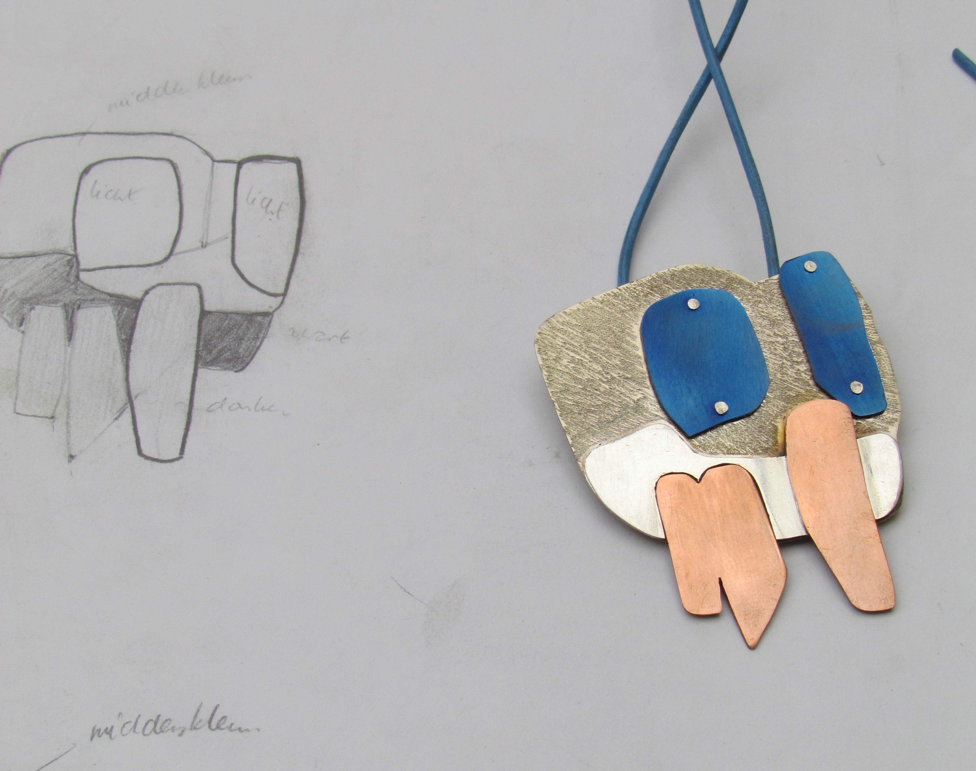Geïnspireerd op haar werk maakte ik de hanger van een gestileerde bomengroep in alpaca, zilver, koper en titanium. De onderplaat is van alpaca, de onderzijde van de bomen is van zilver, de stammen zijn van rood koper en de boomkronen van (met de vlam gekleurd) titanium. Aan de achterzijde is een zilveren buisje gesoldeerd, waar een ketting of koord doorheen kan. Op de foto met een blauw leren koord. De hanger is ruim 4,5 cm breed en 5,5 cm hoog.