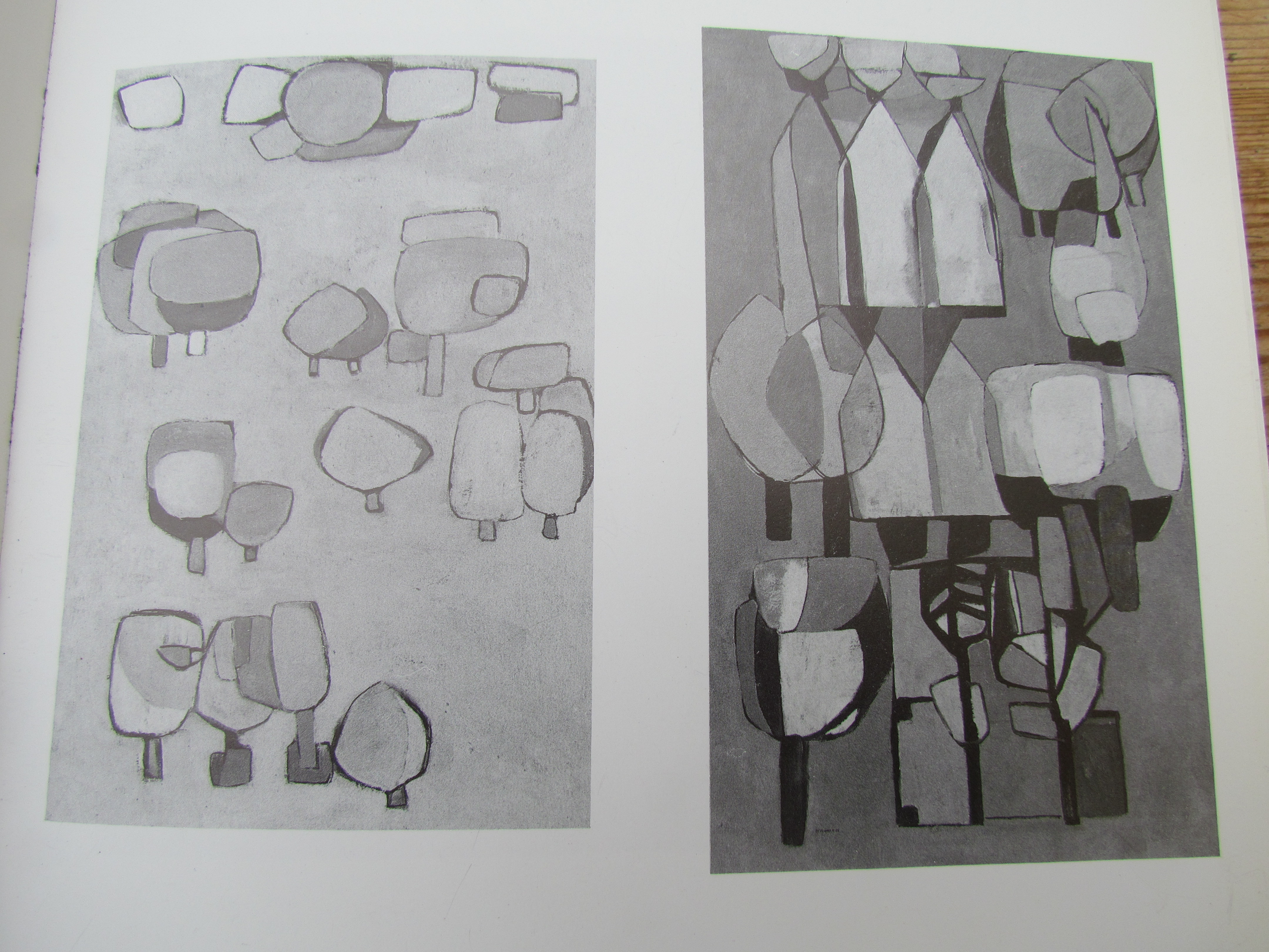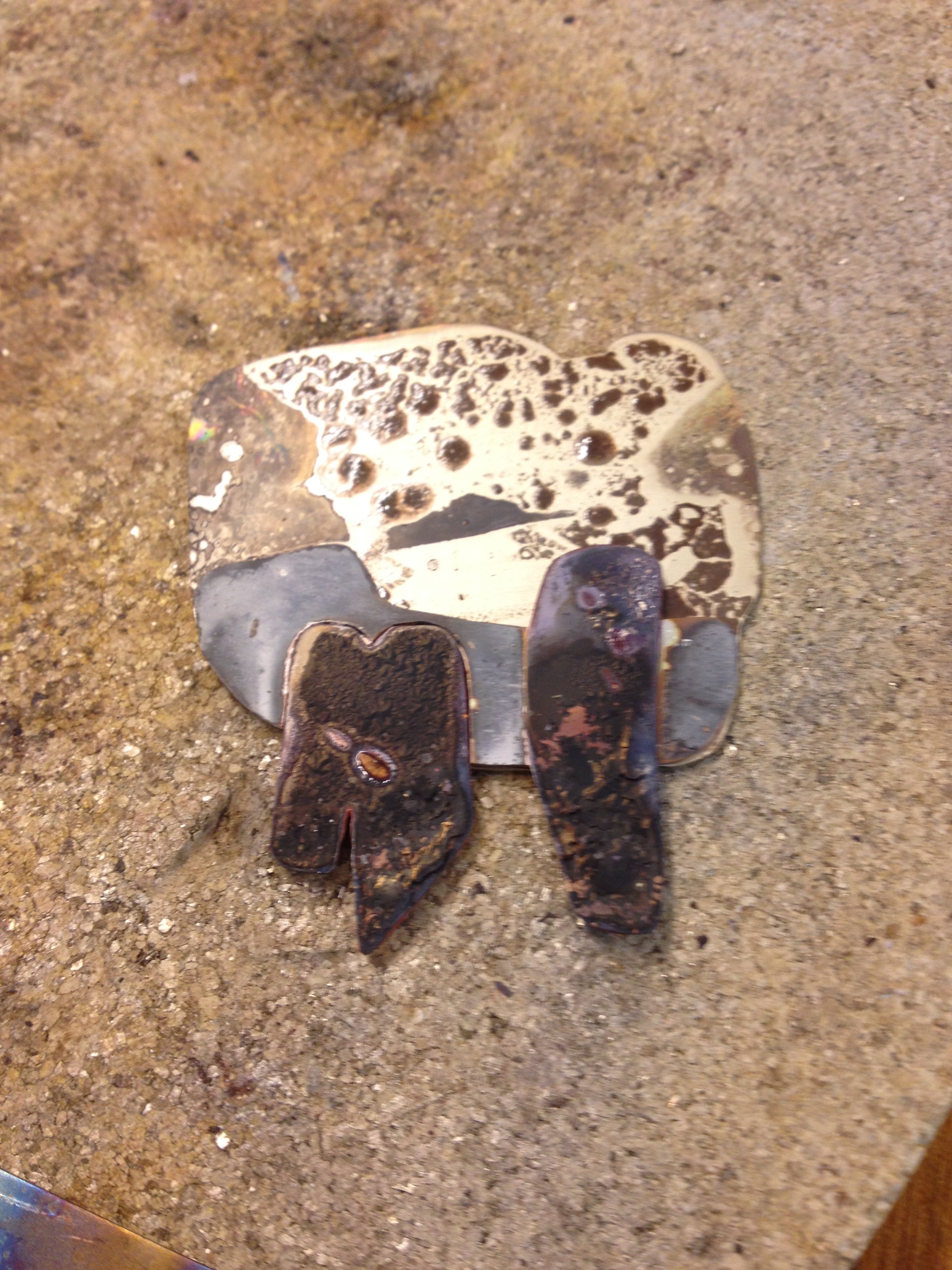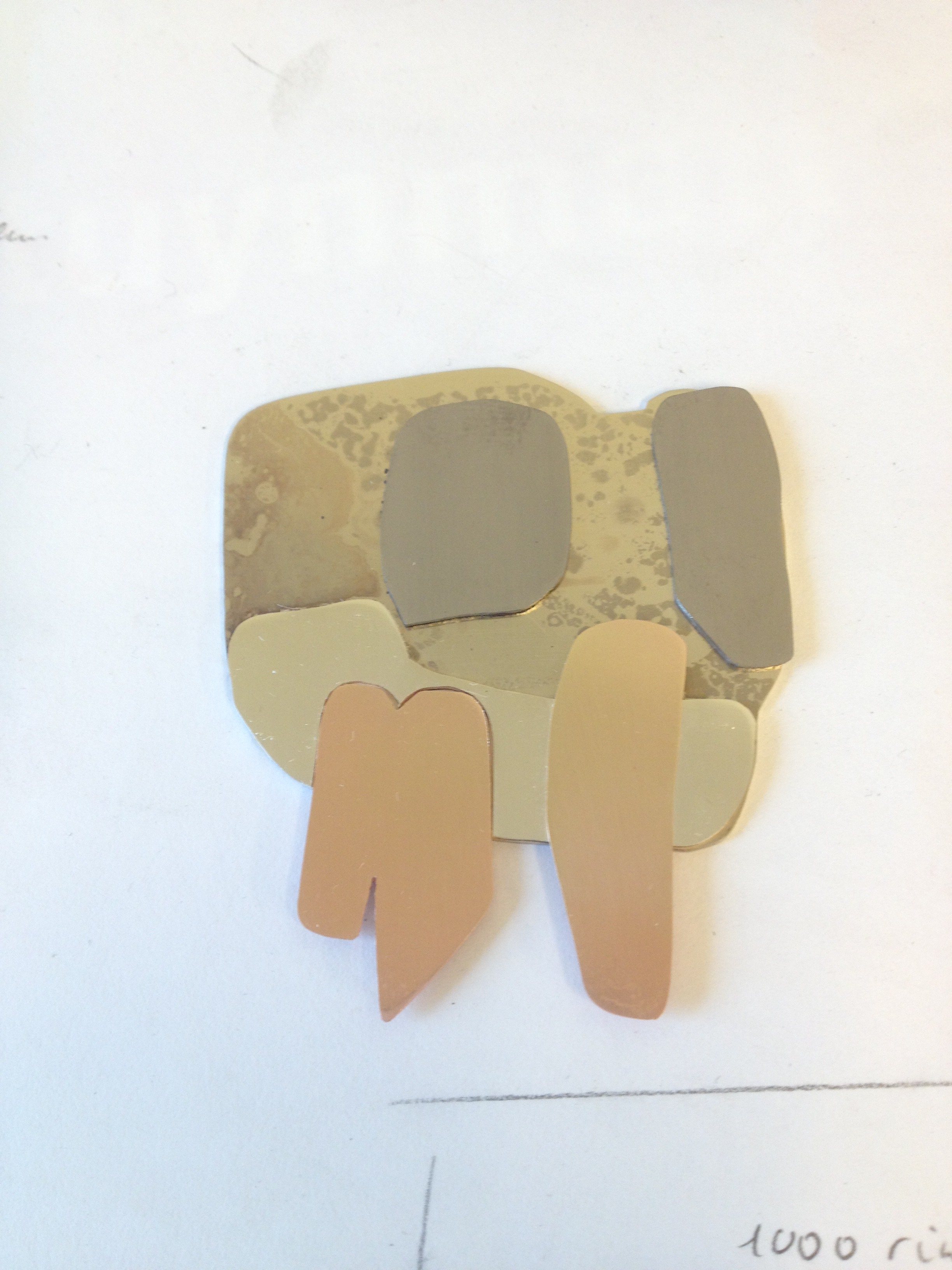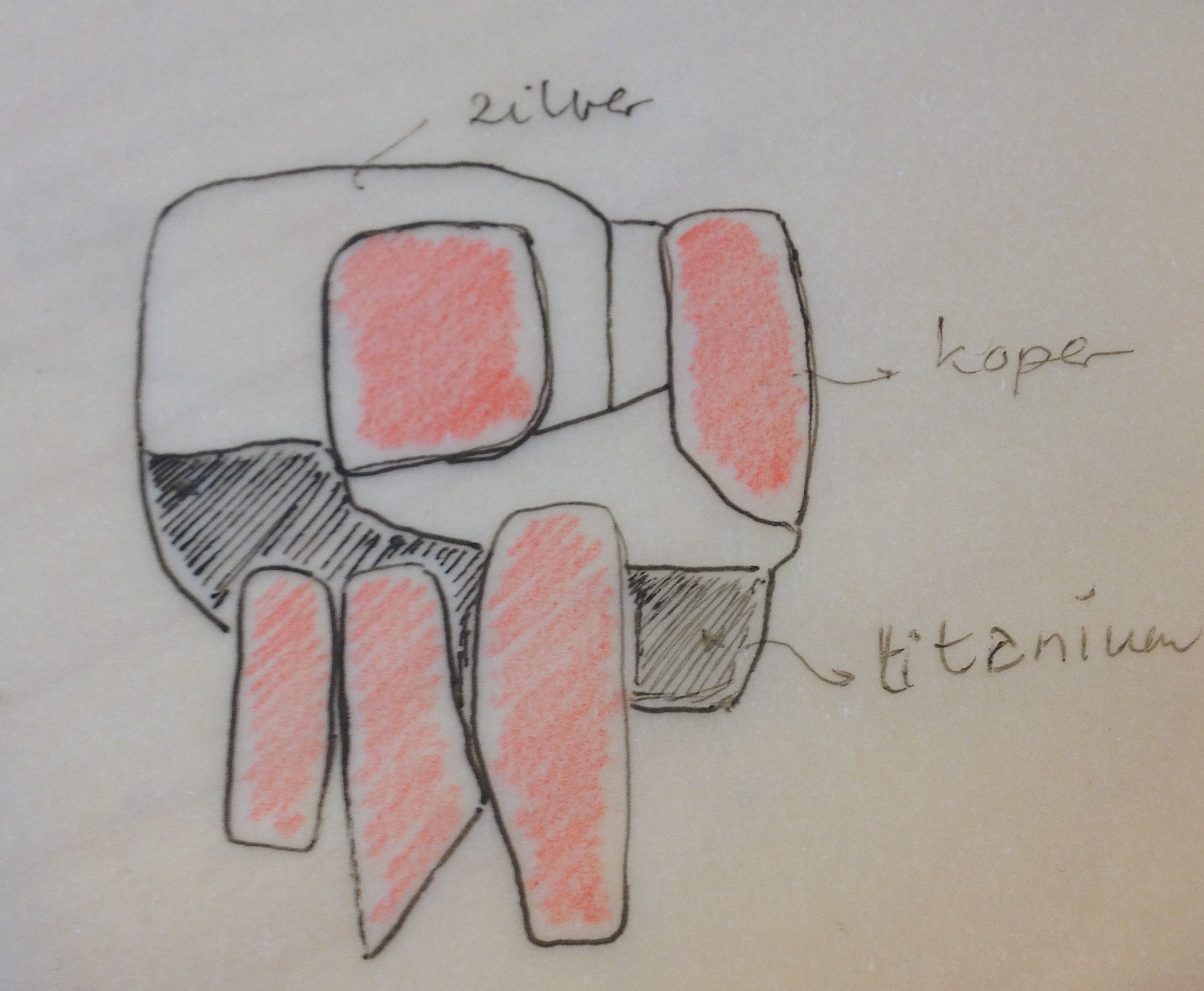 Geïnspireerd op haar werk maakte ik de hanger van een gestileerde bomengroep in alpaca, zilver, koper en titanium. De onderplaat is van alpaca, de onderzijde van de bomen is van zilver, de stammen zijn van rood koper en de boomkronen van (met de vlam gekleurd) titanium. Aan de achterzijde is een zilveren buisje gesoldeerd, waar een ketting of koord doorheen kan. Op de foto met een blauw leren koord. De hanger is ruim 4,5 cm breed en 5,5 cm hoog.