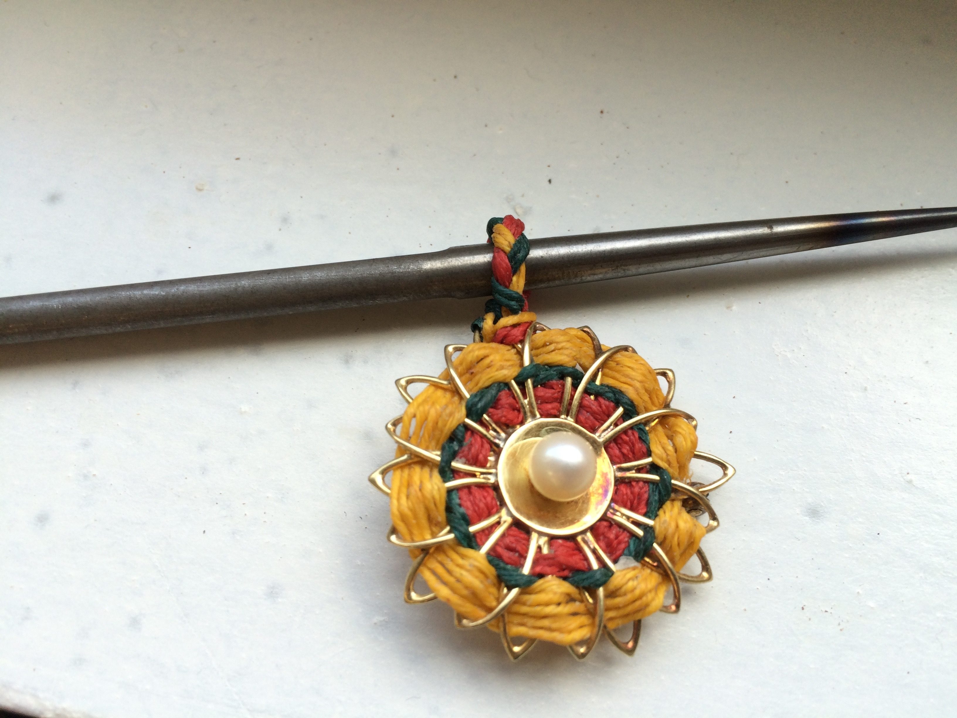 een jaren vijftig gouden broche omgetoverd tot kleurige hanger